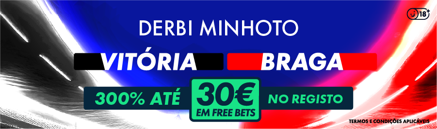 Aproveita já a melhor odd do dia e, caso ainda não faças parte da casa de apostas 100% Portuguesa, prepara-te para ser brindado com uma oferta irresistível no teu registo. São até 30€ em free bets, que podes usar para vibrar ainda mais com o dérbi minhoto!